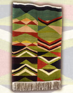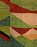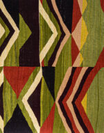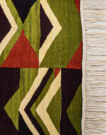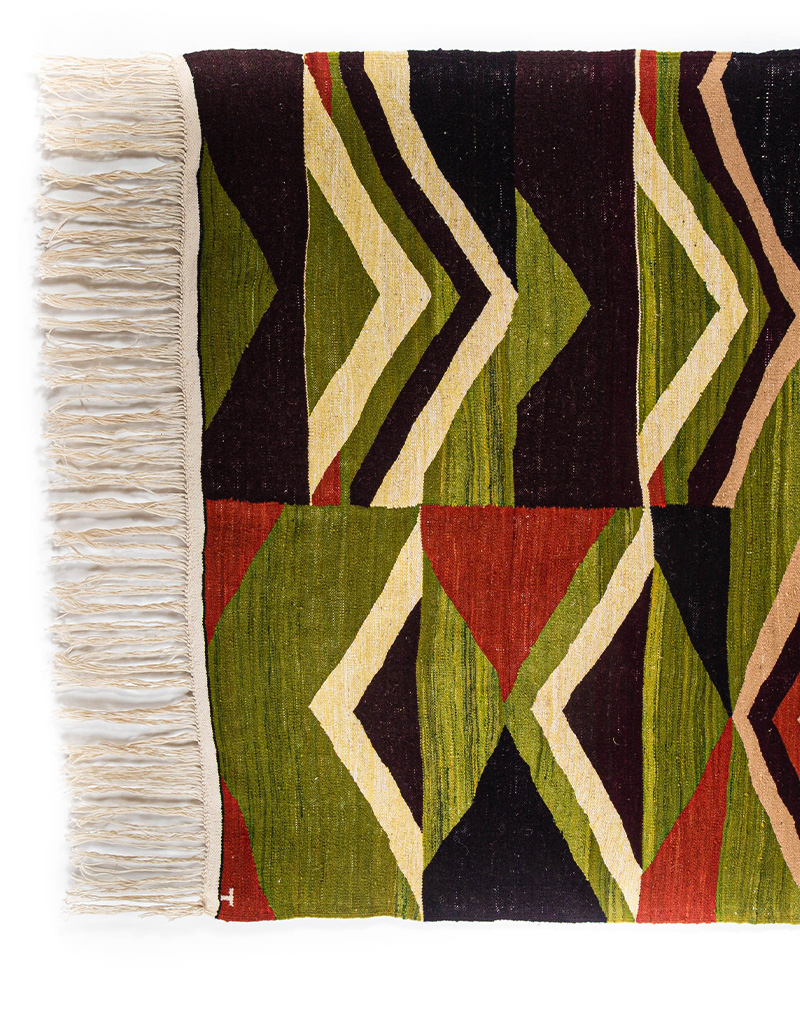 This contemporary design is inspired by a particular moment of the life of the desert, where all the colors, all the flamboiements are possible, unpredictable, and extraordinarily beautiful on the dunes. The "black" moved gradually, thanks to the dark color of the logwood, but the dune field, first flattened and then more and more slender, more and more advanced as you sink into the space in dune, turns from pale yellow to pale green, then dark brown, ocher and then the blaze of red. The mat is a "field" of triangular shapes. Pointing towards the top and looking at the sky, they symbolize the man. Pointing down, towards the earth and fertile, they symbolize the woman.