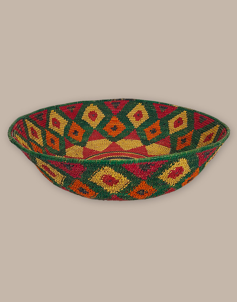 A superb example of the skill of basket weavers from the Hauts Plateaux. Woven from alfa grass, this basket's colors are achieved using natural dyes by the artisans.