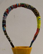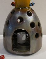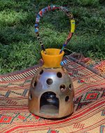 En céramique émaillée, ce photophore à suspendre, jaune et métal, a une anse « habillée » de wax. Réalisation Soupçon d’Art .